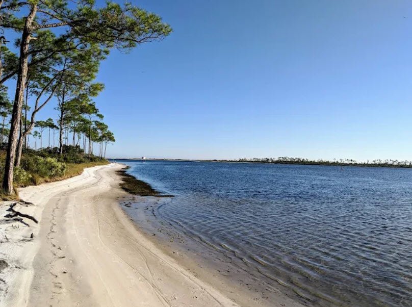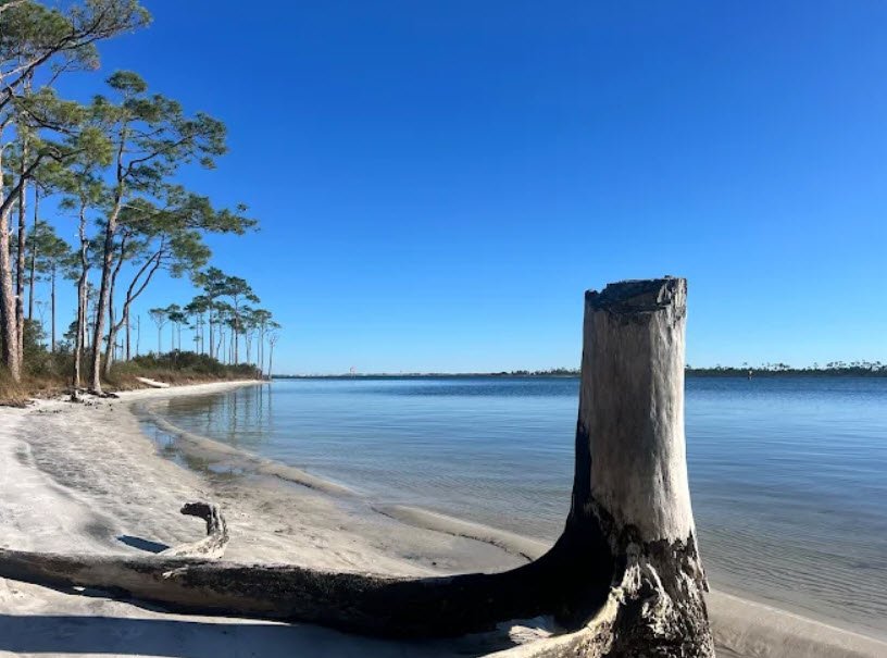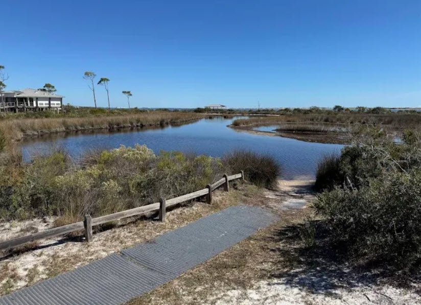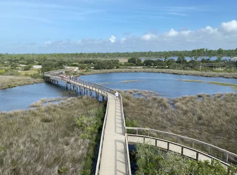 Acquired starting in 1977 with evidence of Woodland and Mississippian period occupation plus 20th-century sites like Miss Ivey's burger stand, it features nine natural communities from estuarine tidal marshes to scrubby flatwoods, hosting gopher tortoises, snowy plovers, least terns, and over 20 other listed species as a Great Florida Birding Trail gateway.