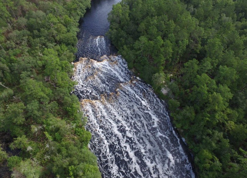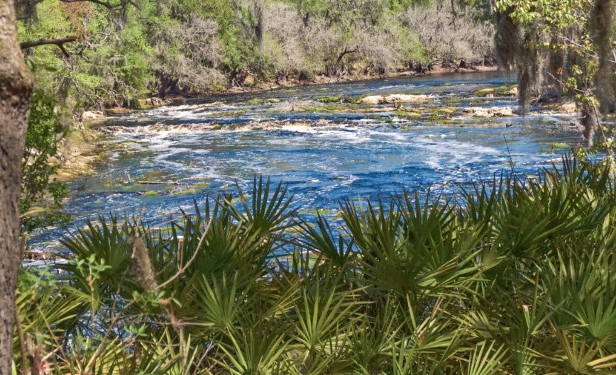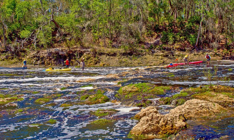 Big Shoals State Park in Hamilton County near White Springs, Florida, USA, protects the largest whitewater rapids in the state along the Suwannee River, with limestone bluffs rising 80 feet for dramatic vistas unique to Florida.