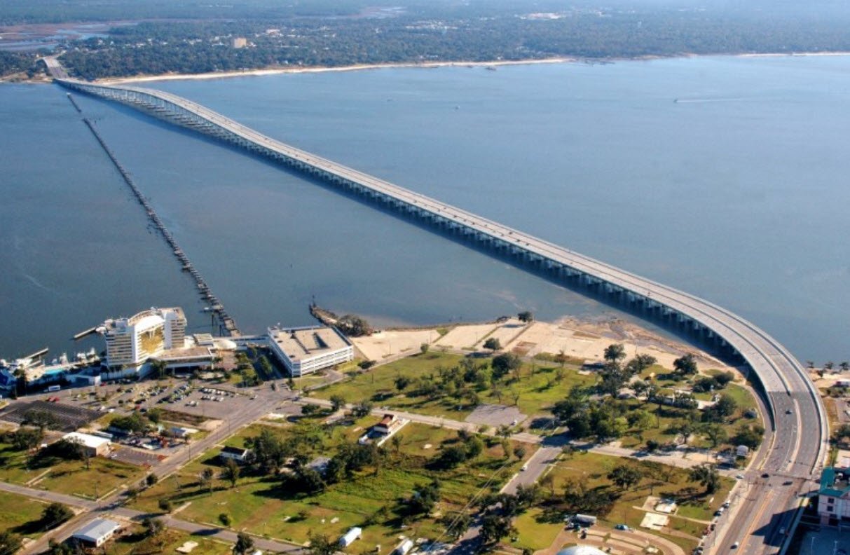 Originally built in 1962 as a four-lane structure with a drawbridge, it was severely damaged by Hurricane Katrina in 2005. It was rebuilt and reopened to traffic in November 2007 with a widened design featuring six lanes—three lanes in each direction—and a 12-foot-wide pedestrian and bicycle path on the Gulf-facing side. The new 1.6-mile-long bridge was constructed to withstand hurricane-force winds and waves, with a vertical clearance of about 95 feet to accommodate marine traffic below.
