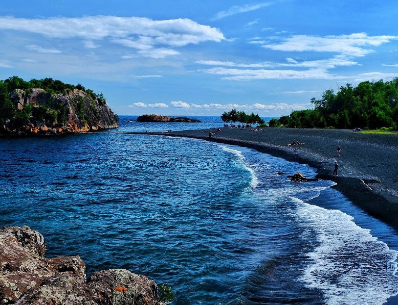 Black Beach in Silver Bay, Minnesota, is a unique lakeside destination on the shore of Lake Superior known for its distinctive black sand, a rare feature in the region.