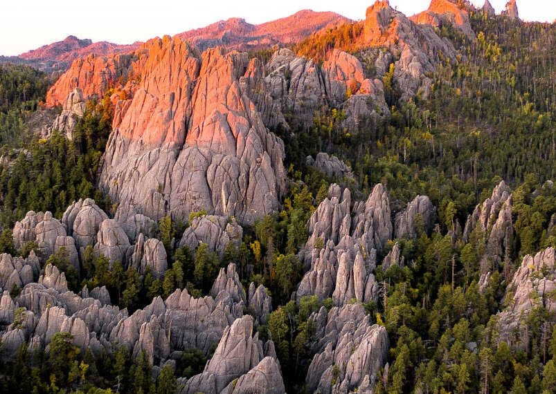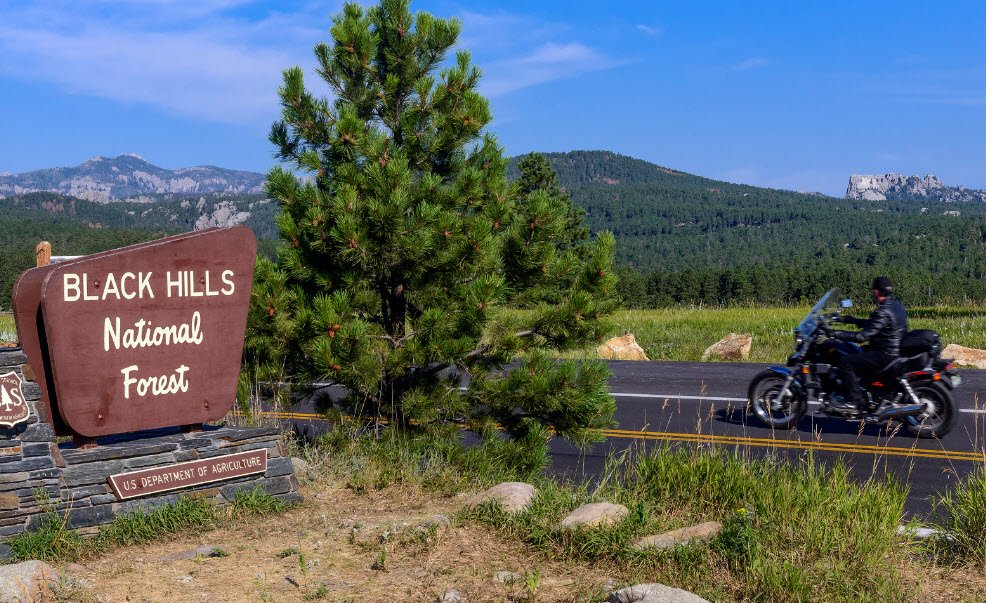 The Black Hills National Forest spans over 1.2 million acres across western South Dakota and northeastern Wyoming, characterized by rugged pine-covered hills that rise dramatically above the surrounding plains.