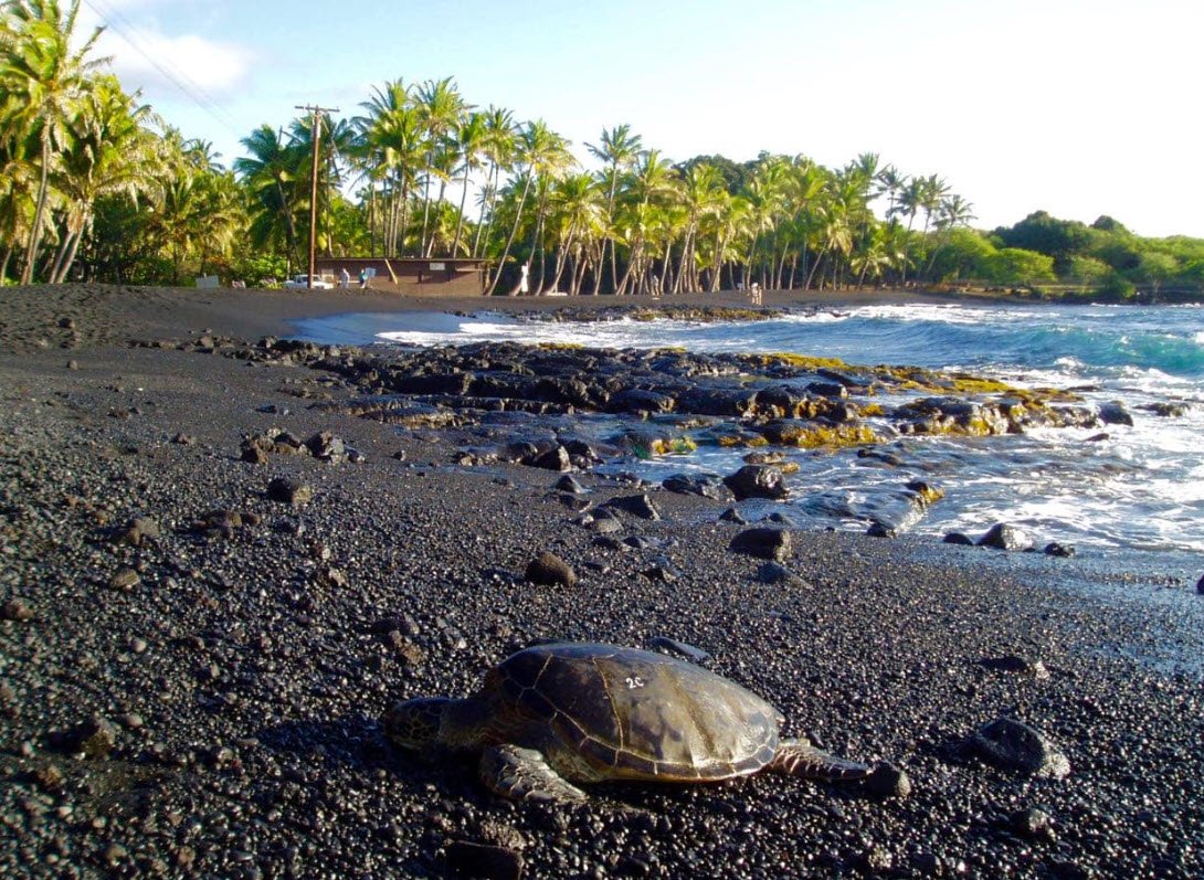 The beach is located between the towns of Pāhala and Nāʻālehu in Kaʻū and is famous for its unique volcanic landscape and clear, warm waters. It is a habitat for endangered Hawaiian green sea turtles (honu), which bask on the black sand, adding to the beach's natural beauty.