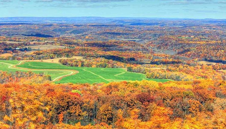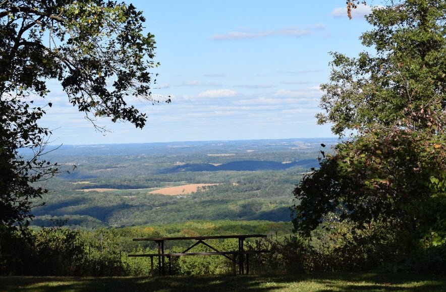 Blue Mound State Park spans 1,153 acres atop the highest point in southern Wisconsin at 1,719 feet near Blue Mounds village, offering panoramic views from two observation towers of the Wisconsin River valley, Baraboo Range, Driftless Area, and Madison.