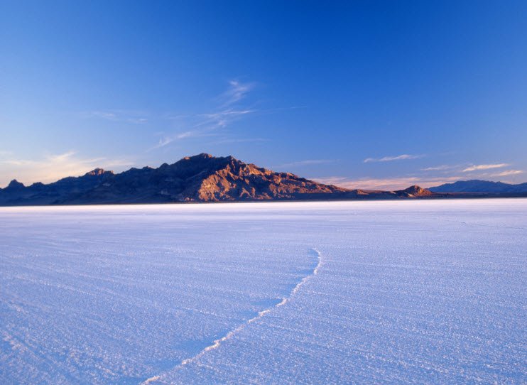 The Bonneville Salt Flats in northwestern Utah are a vast, flat expanse of densely packed salt covering about 12 miles long and 5 miles wide, formed as a remnant of ancient Lake Bonneville from the last Ice Age.