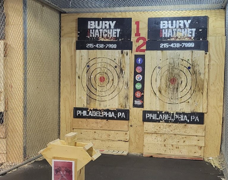 Bury The Hatchet Axe Throwing in Philadelphia, Pennsylvania, was an indoor recreation center located at 1719 Washington Avenue on the second floor, where participants could enjoy safe and supervised axe throwing sessions.