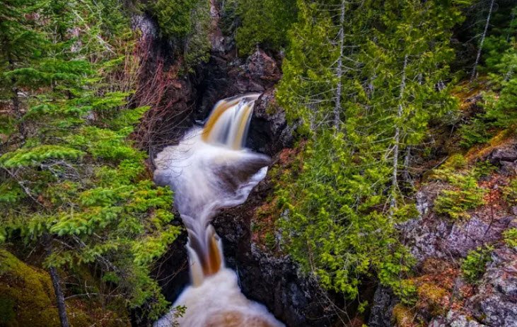 Cascade River State Park lies on Minnesota's North Shore near Lutsen, where the Cascade River plunges 120 feet through a dramatic gorge to Lake Superior, creating a series of stunning cascades and waterfalls accessible via short, scenic trails with overlooks and a footbridge.
