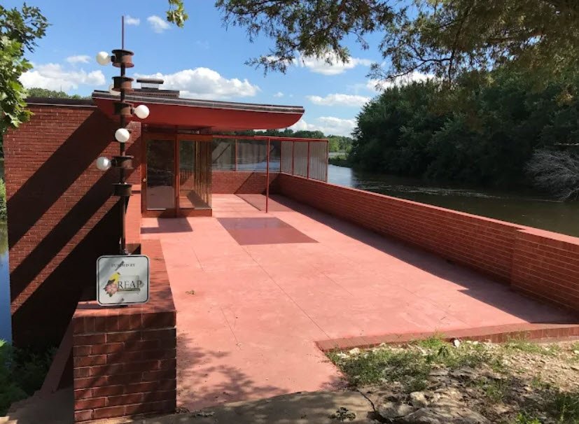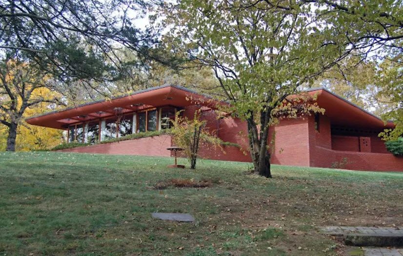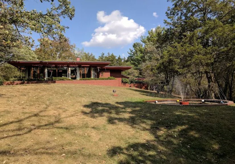 Commissioned by Des Moines businessman Lowell Walter after selling his road-building company, the estate features Wright's signature red square tile—marking one of his most complete designs including custom furniture, built-ins, and a rare original boat pavilion—blending seamlessly with its limestone bluff site.
