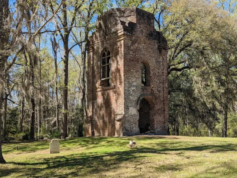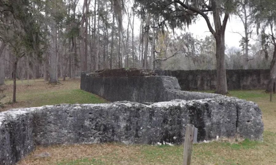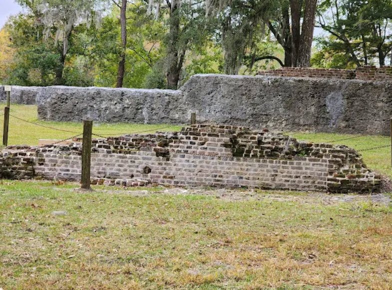 It features one of the country's best-preserved oyster-shell tabby forts from the French and Indian War, the striking redbrick bell tower of St. George's Anglican Church built in 1751, log wharves, cemeteries, and ongoing archaeological digs revealing the town's prosperous past until its abandonment during the Revolutionary War.
