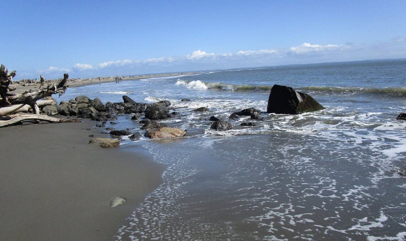 Visitors park outside a gated entrance due to road washouts, then hike roughly four miles around beaches surrounded by water on three sides, enjoying panoramic views of the Olympic Mountains, Mount Rainier, and Westport, plus beachcombing for agates, clamming, fishing, and wildlife viewing.