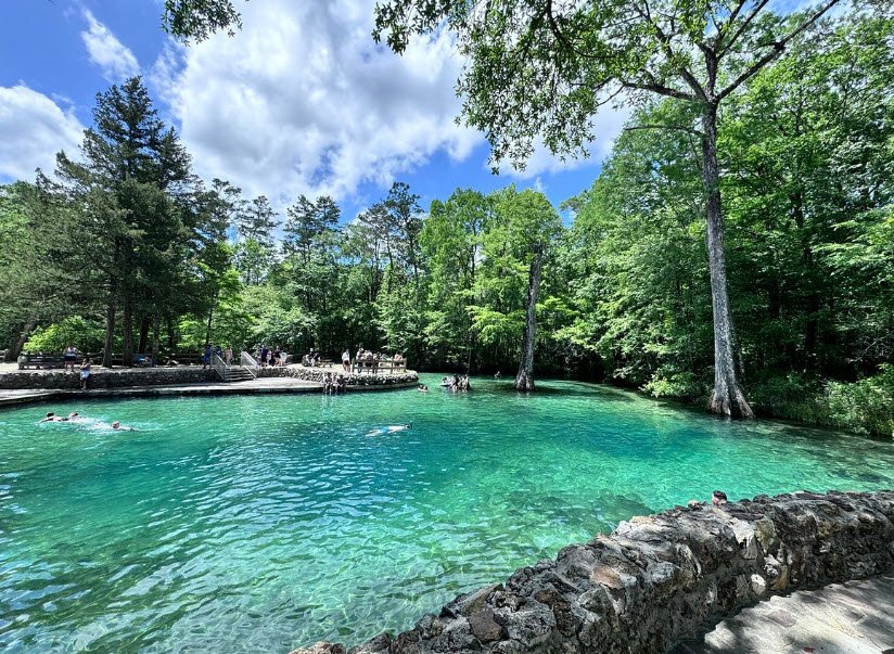 Activities include swimming and snorkeling in the spring pool, canoeing or kayaking the spring run, hiking the 4-mile Wild Persimmon Trail through cypress swamps, guided boat tours to Lake Woodruff National Wildlife Refuge, fishing, picnicking, and birdwatching, open daily from 8 a.m. to sunset.