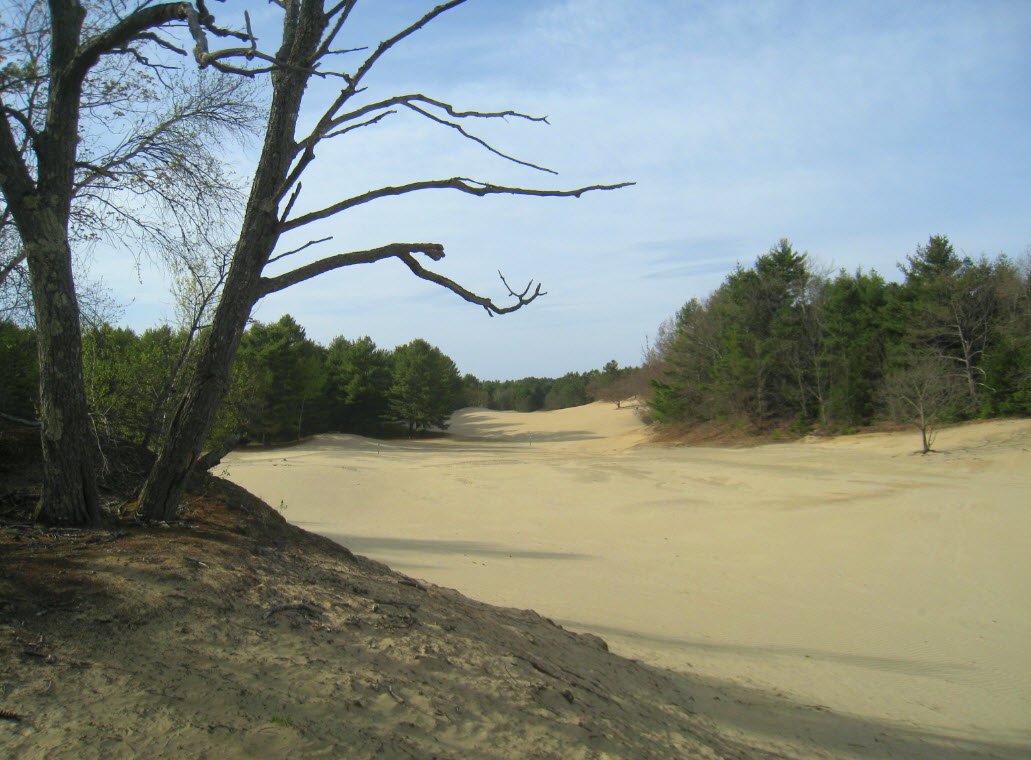 The Desert of Maine is a unique natural attraction located in Freeport, Maine, known for its 20 acres of exposed glacial sand dunes that resemble a desert landscape in the middle of a forested region.