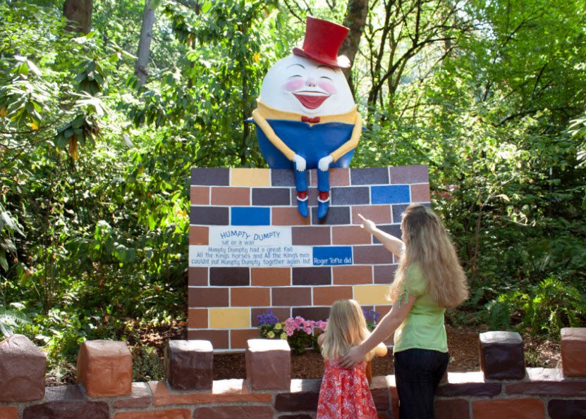 Enchanted Forest, a family-built theme park near Turner off Interstate 5 south of Salem, Oregon, opened on August 8, 1971, after Roger Tofte spent seven years hand-sculpting storybook scenes like Humpty Dumpty, Little Miss Muffet, and Snow White's cottage using cement, rebar, and plaster on 20 wooded acres purchased for $4,000, drawing 75 visitors its first day and 1,000 the next Sunday at $1 adult admission.