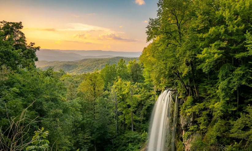 Falling Spring Falls State Park is a compact 19-acre site in Alleghany County, Virginia, featuring one of the state's tallest waterfalls at 80 feet high, plunging dramatically over a rocky ledge into the valley below near Covington.
