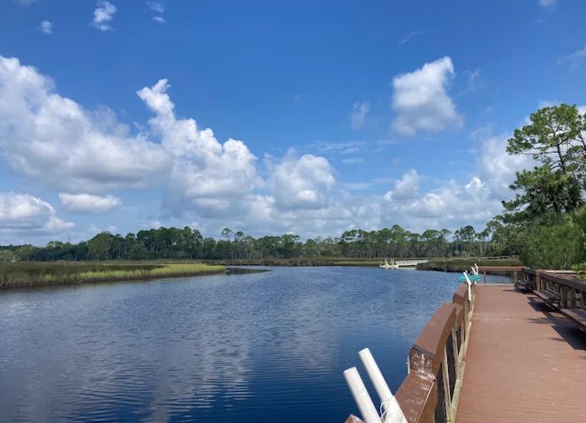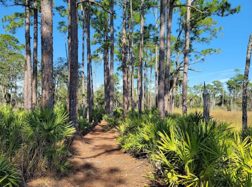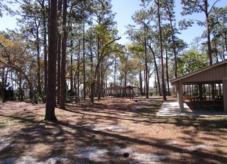 Open daily from 8 a.m. to sundown, it offers a serene escape into raw Northeast Florida nature close to highways yet rich in history and biodiversity. The park's wooden pavilions overlook tranquil lakes framed by pines, providing shaded spots for relaxation. Lush palmettos and pines line calm lake shores, enhancing the park's peaceful, reflective atmosphere.