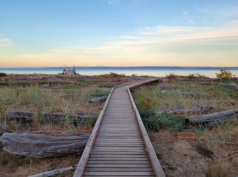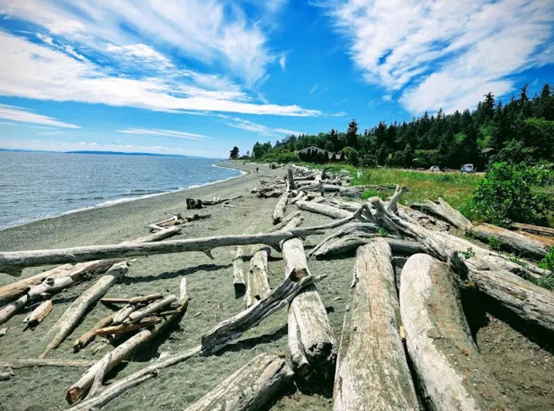 Open from dawn to dusk, it provides beachcombing on sandy and rocky shores, marine camping sites, picnic areas, restrooms, showers, and stunning views across Puget Sound to the Cascade Mountains, with Mount Rainier and Mount Baker visible on clear days.