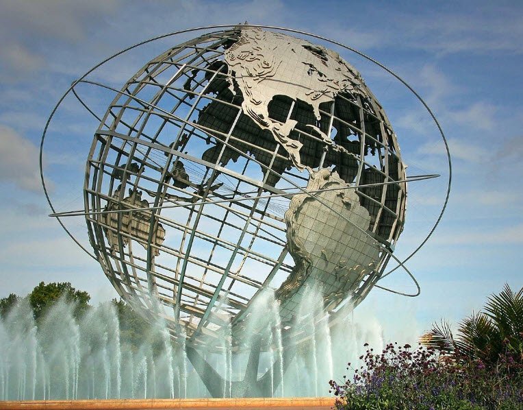 Flushing Meadows-Corona Park in Queens, New York, spans nearly 900 acres as the borough's largest park, transformed from a tidal marsh and infamous Corona Ash Dump—"valley of ashes" in The Great Gatsby—by Robert Moses in the 1930s into the site of the 1939-1940 World's Fair themed "The World of Tomorrow," followed by the 1964-1965 Fair's "Peace Through Understanding" with icons like the Unisphere, New York State Pavilion, and Queens Museum.