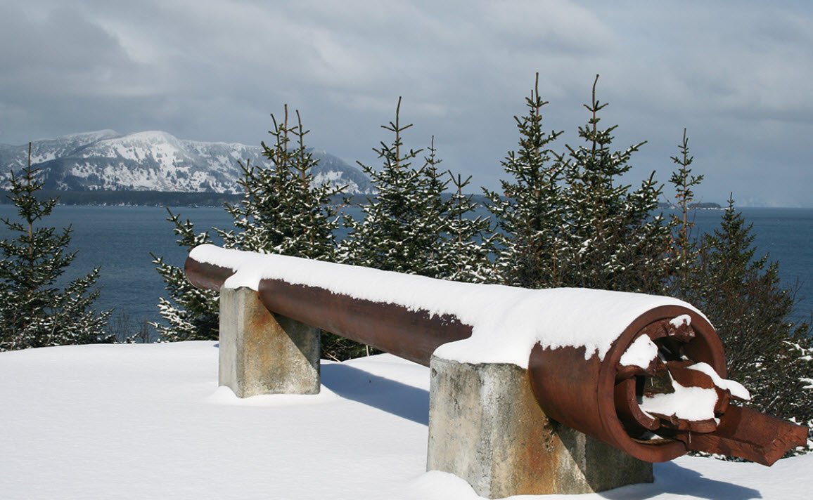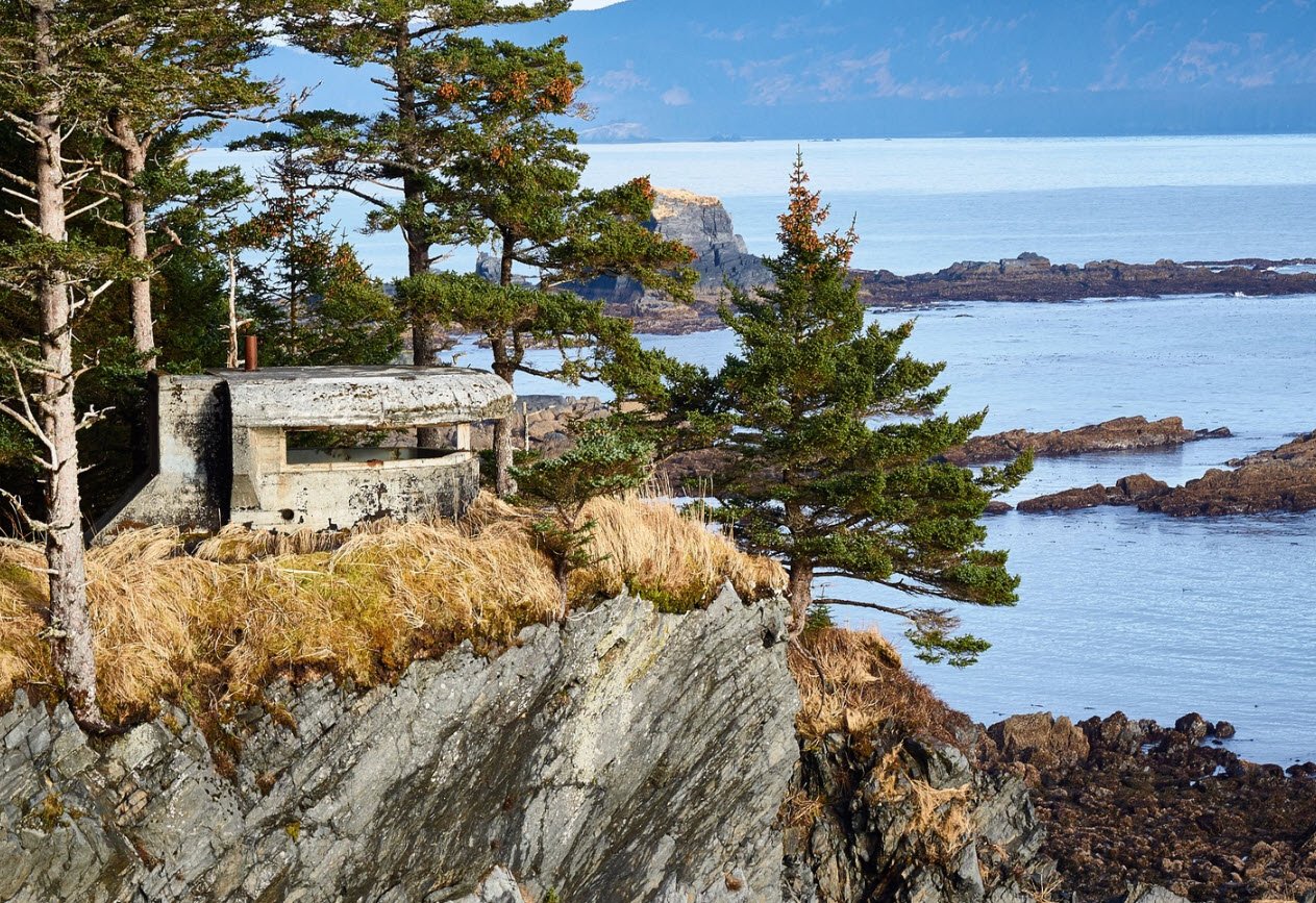 These fortifications, including gun emplacements, underground magazines, and building foundations, were constructed to protect the Kodiak Naval Base during the war but saw no combat action. The park features scenic bluffs overlooking the ocean, spruce forests, and meadows, providing a combination of natural beauty and historical significance.