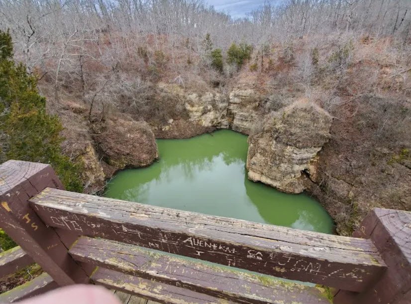 A massive natural bridge spans 250 feet across it with a 75-foot-high opening, while a stream from 28 square miles drains underground, resurfacing miles away at Mammoth Spring in Arkansas. Acquired by conservationist Leo Drey and leased to the Missouri Department of Natural Resources since 1984.