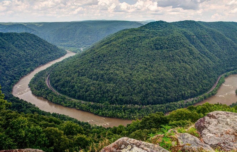 Grandview in West Virginia is a scenic area within the New River Gorge National Park and Preserve known for its breathtaking panoramic views of the New River Gorge from 1,400 feet above the river.