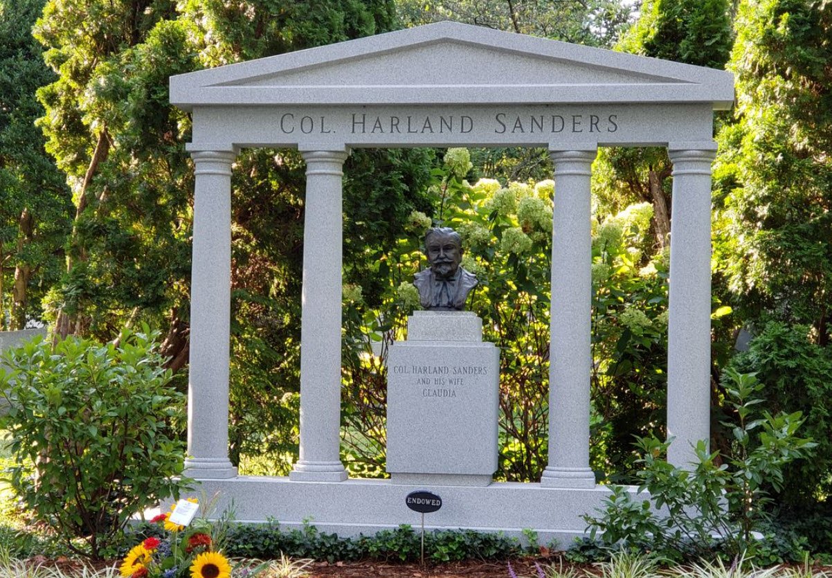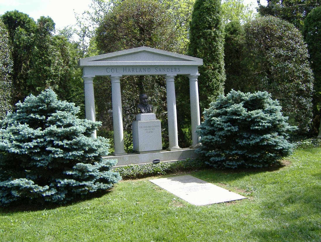 Colonel Sanders, who became a symbolic figure of the KFC brand worldwide, was buried there in 1980 after a memorial at the Kentucky State Capitol and a funeral service attended by hundreds. His grave is part of the historic and scenic Cave Hill Cemetery, where many notable Kentuckians are buried.