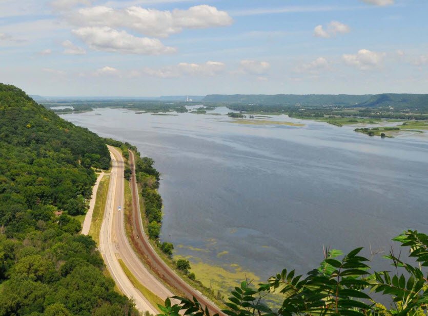 The Great River Road in Wisconsin is a scenic 250-mile route that follows the Mississippi River along State Highway 35 from Prescott to Kieler.