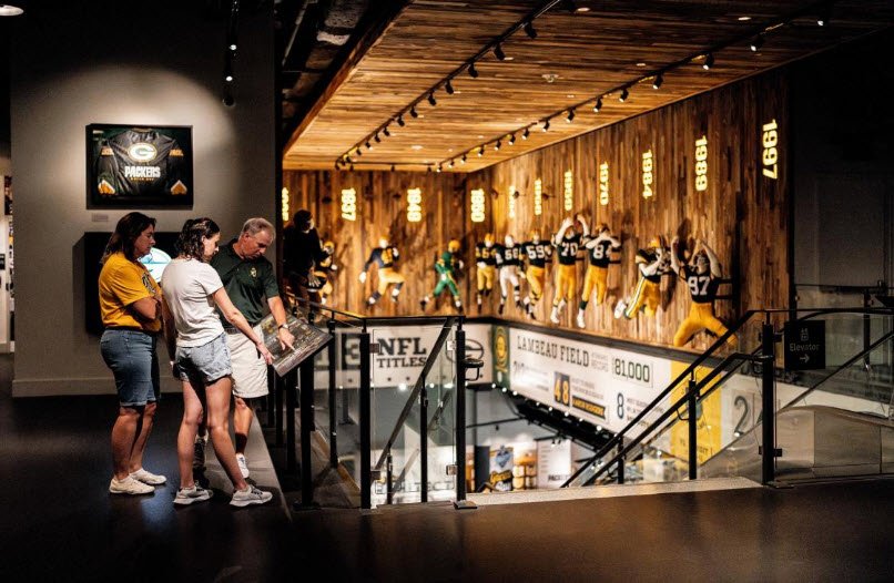 It features a vast array of memorabilia including plaques for each inductee, Lombardi trophies, a re-creation of legendary coach Vince Lombardi's office, and interactive exhibits that cover the team’s season-by-season history and notable players. The Hall of Fame honors Packers legends through annual induction ceremonies and serves as both a historical archive and an educational resource, drawing millions of visitors with its blend of sports history, technology, and local pride.