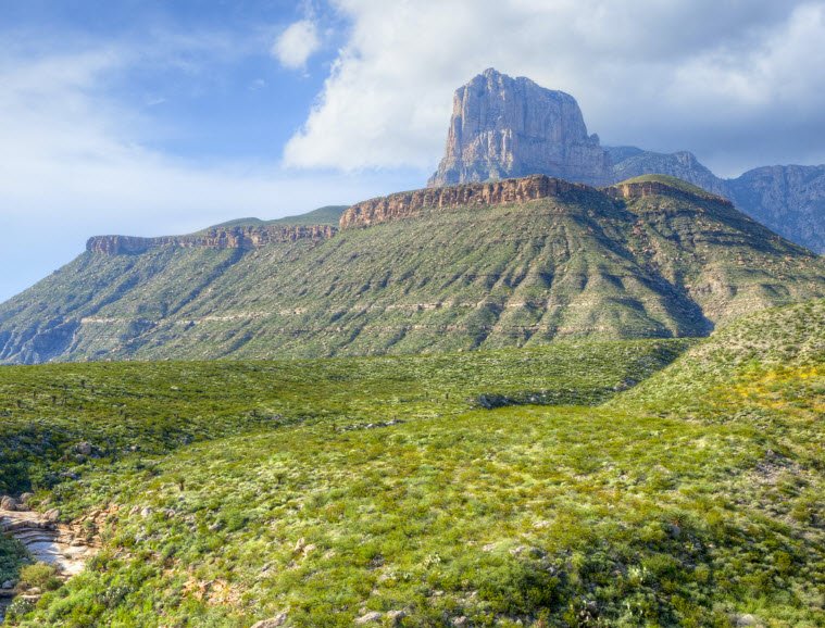 Guadalupe Mountains National Park in western Texas, near the New Mexico border, protects a rugged mountain range rising more than 3,000 feet above the surrounding Chihuahuan Desert.