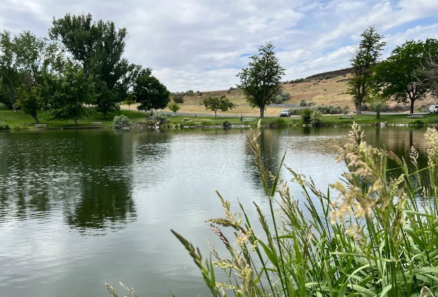 Amenities include a stocked trout pond, boat ramp for walleye and sturgeon fishing, swimming beach, sand volleyball, shaded picnic shelters, and 92 RV/tent sites amid sagebrush hills and cottonwoods.