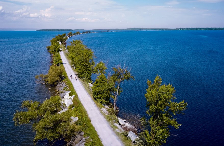 The causeway is built upon large marble boulders and offers a close-to-water experience as it slices across Lake Champlain. The trail is popular for biking, walking, and sightseeing, with points of interest like the Burlington Earth Clock and historic Union Station along the route.
