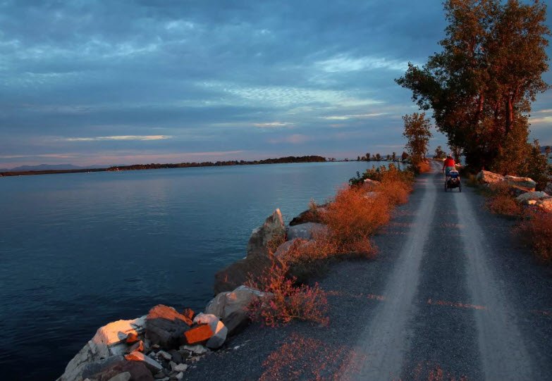 It follows the route of a historic railroad built in 1901 and features a unique causeway that extends about three miles out over the lake, offering spectacular views of the water and surrounding mountains. The trail includes a mix of paved and crushed limestone surfaces, with a notable segment where cyclists and pedestrians cross a 200-foot gap using a seasonal bike ferry in the summer months, which is operated by Local Motion.