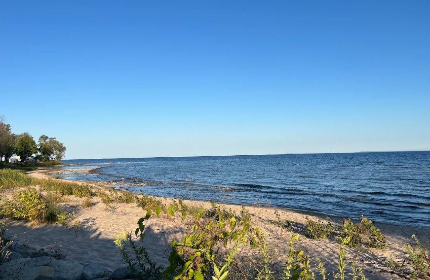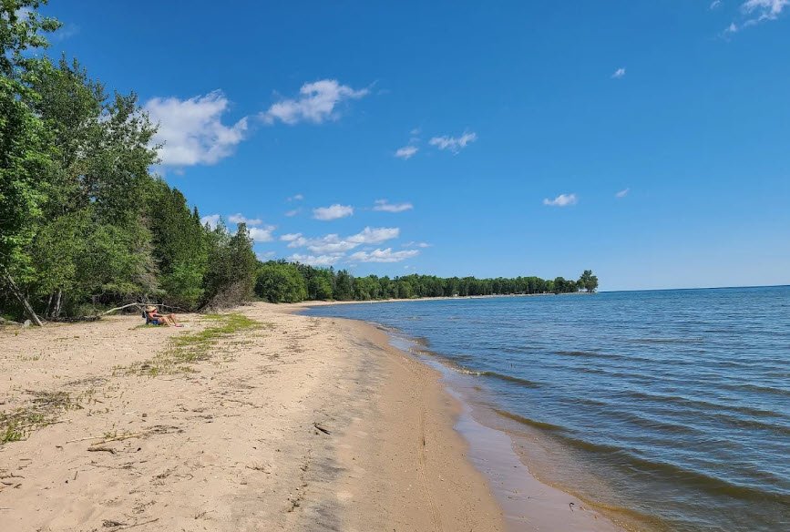 The park runs along about three miles of sandy shoreline, offering a designated swim beach, picnic areas, a modern campground, and rustic cabins that are open year‑round, making it a popular family‑friendly destination for swimming, fishing, and paddling on the calm bay waters.