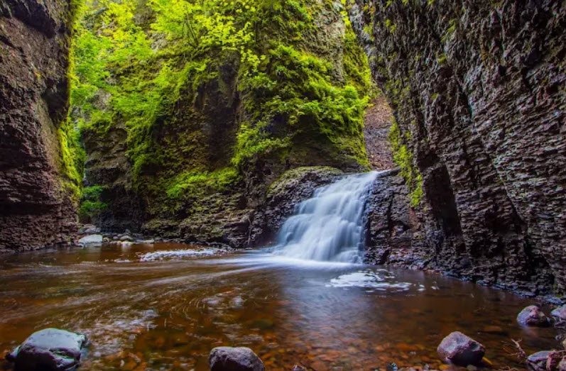 Established in 1947 as a state park and later redesignated a wayside, it offers a short 1.1-mile out-and-back trail from lakeside parking—limited to six hours—with picnic tables, a gravel beach, and access to the Superior Hiking Trail spur for views of small waterfalls, cascades, and wading pools amid boreal forests.