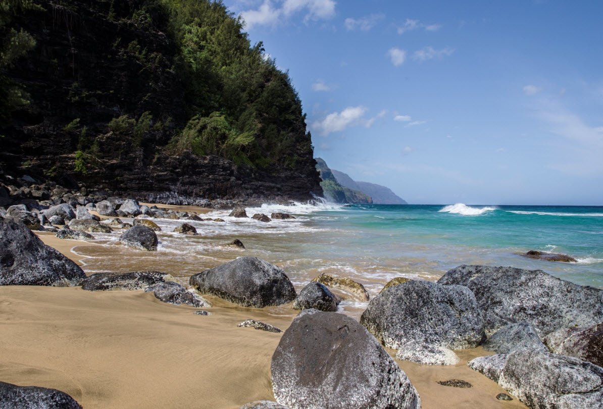 It is the starting point of the renowned Kalalau Trail, leading along the breathtaking Nā Pali Coast, offering dramatic views of towering cliffs and lush landscapes. The beach features soft white sand, tide pools popular with families, and frequent sightings of marine life such as Hawaiian monk seals and tropical fish.