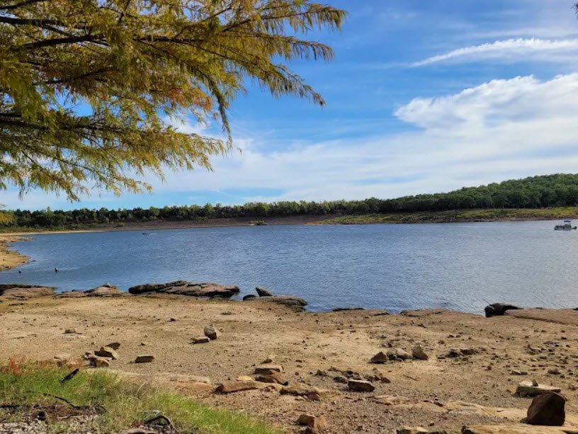 Popular for striped bass, walleye, black bass, crappie, and catfish fishing, boating, water skiing, swimming beaches, and hiking, it serves as an urban escape amid wooded hills and sandy shores near historic sites like old Fort Arbuckle.