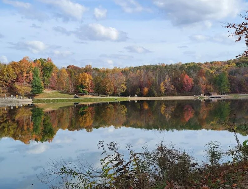 Lake Alma State Park covers 292 acres in the rugged unglaciated hill country of Jackson and Vinton Counties, southern Ohio, featuring a quiet 60-acre lake and a gentle creek winding through a wooded valley.