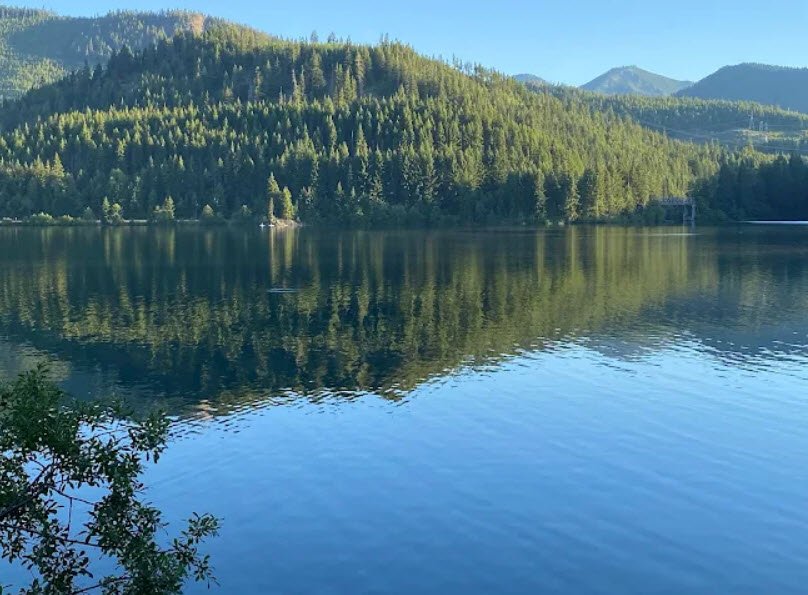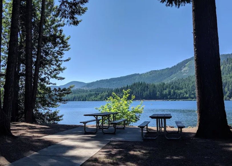 Positioned conveniently off Interstate 90 between Seattle and Ellensburg at about 2,165 feet elevation, it draws families and travelers for year-round activities including tent and RV camping with 135 sites up to 60 feet long, picnicking, swimming at a sandy beach, boating limited to 10-horsepower motors due to submerged hazards, fishing for trout and kokanee, and forested hiking or biking trails linking to the nearby Palouse to Cascades State Park Trail.