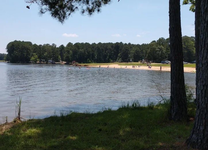 Shaded by towering hardwoods like dogwood, magnolia, pine, and loblolly, it features 71 RV campsites with full and electric hookups accommodating big rigs up to 82 feet, one cabin, three cottages, picnic areas with shelters and grills, a swimming beach, nature trail, playground, volleyball court, and disc golf course.