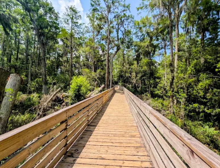 Activities include canoeing, kayaking, paddleboarding, and fishing on the lakes—electric motors only—plus 20 miles of hiking trails, 16 miles of equestrian paths, 7 miles of paved biking roads, swimming at a designated beach, camping, picnicking, and birdwatching, with the park open daily from 8 a.m. to sundown. Dirt trails wind through dense pine and oak forests with lush undergrowth, providing shaded paths for exploration.