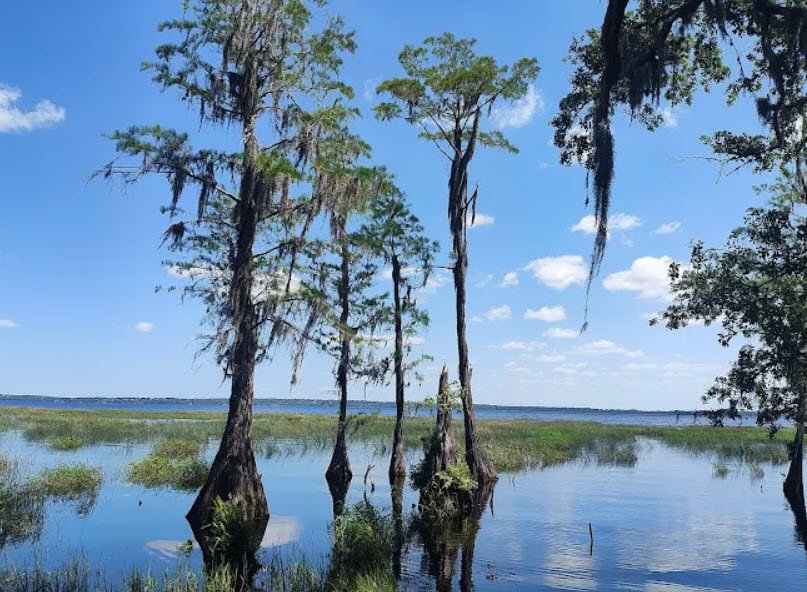Located near the Lake Wales Ridge, it hosts rich wildlife like deer, bobcats, gopher tortoises, bald eagles, and osprey across 11 natural communities, offering a peaceful escape 30 minutes from Orlando's theme parks. Sandy lakeshores with moss-draped trees and marshy peninsulas create serene waterside scenes under partly cloudy skies.