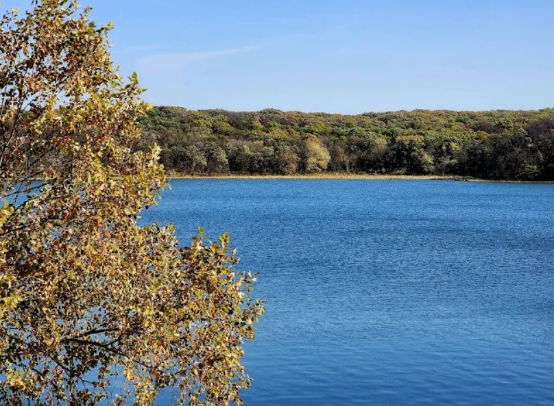 A 7-mile lakeshore trail winds through prairie and woods for hiking, snowmobiling, and cross-country skiing, complemented by 89 campsites (44 electric), 13 cabins, shaded picnics, playgrounds, and erosion controls enhancing water clarity.