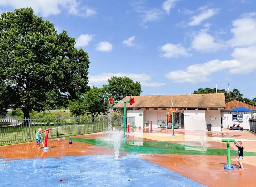 It features five camping areas with RV sites offering water and electric hookups, tent pads, primitive group camps, modern cabins, comfort stations with showers, dump station, picnic shelters, playgrounds, a swimming beach, water spray park, lighted boat ramps, fishing docks, and a nature center.