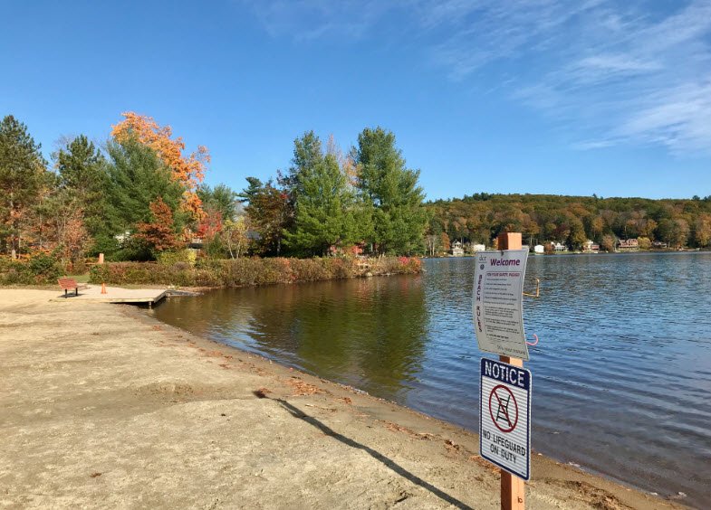 The clear 128‑acre lake provides opportunities for swimming, fishing, and non‑motorized boating, while the park itself offers a sandy beach, picnic areas with grills, restrooms, and a network of trails used for walking, hiking, cross‑country skiing, and snowmobiling.