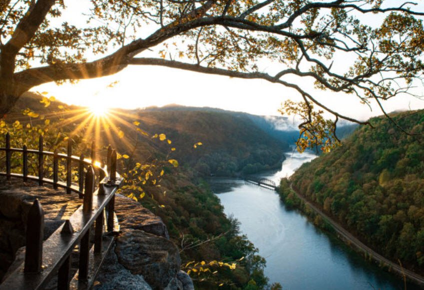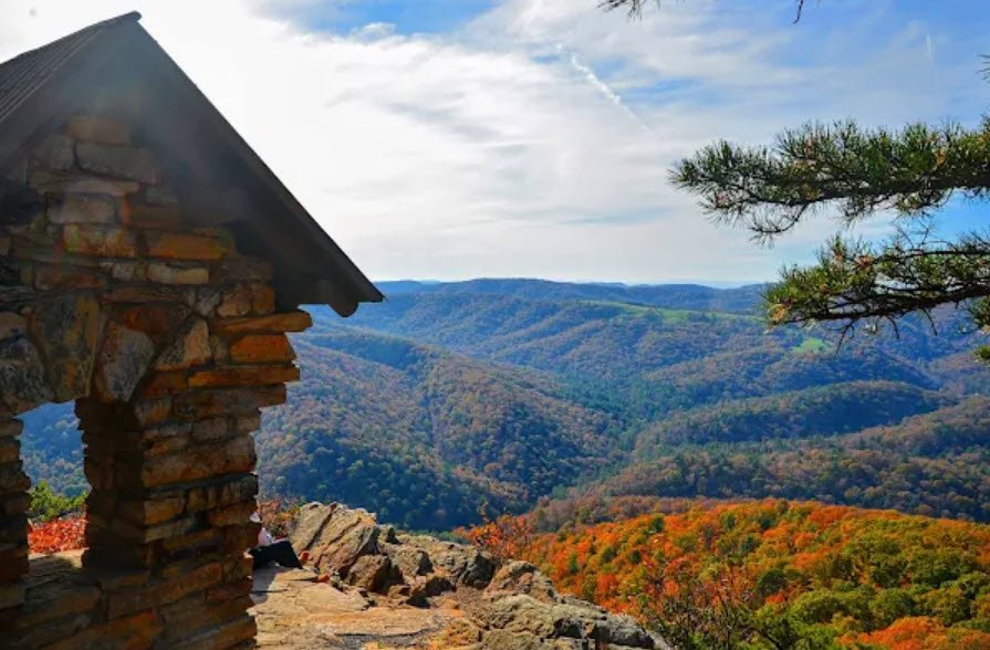 Built by the Civilian Conservation Corps since 1934 and opened in 1937 near the 1756 Battle of Lost River site, it features 26 vacation cabins, hiking trails to the iconic Cranny Crow overlook atop Big Ridge Mountain with views across five counties, horseback riding, a seasonal swimming pool, tennis, volleyball, archery, and historic sites like the 1804 Lighthorse Harry Lee Cabin listed on the National Register of Historic Places.