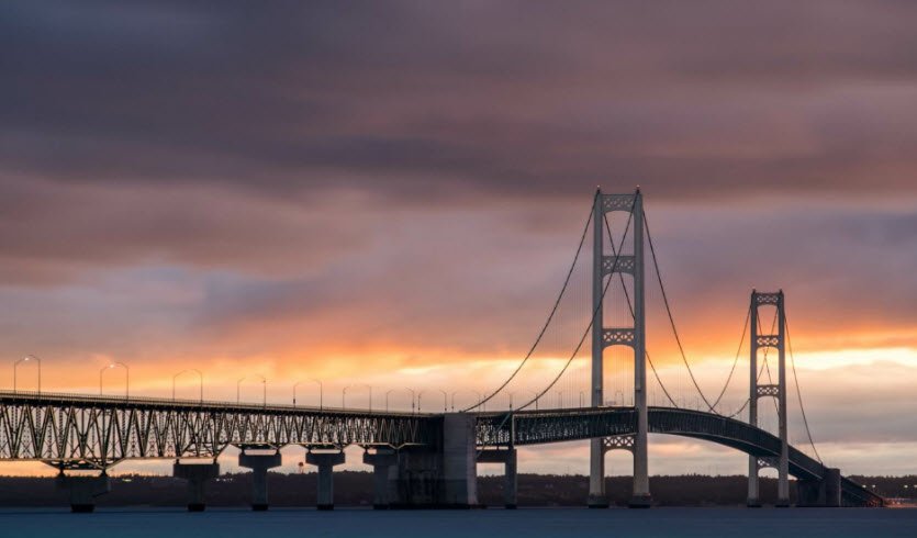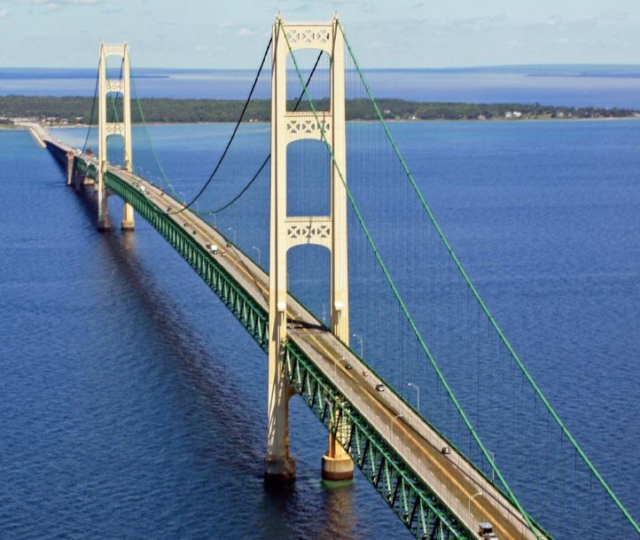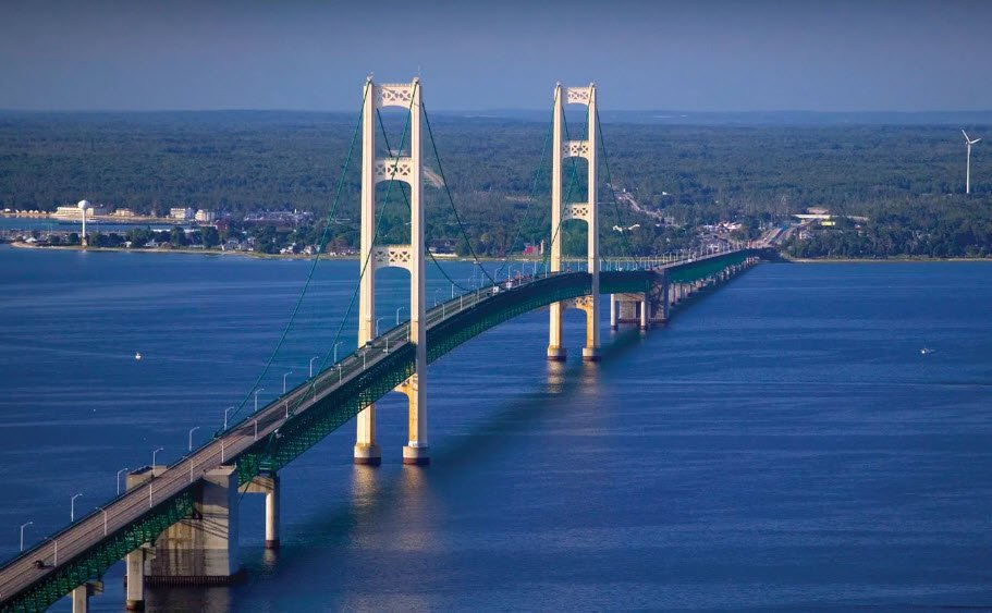 The Mackinac Bridge, also known as the "Mighty Mac," is a massive suspension bridge in Michigan connecting the Upper and Lower Peninsulas by spanning the Straits of Mackinac between Lake Michigan and Lake Huron.