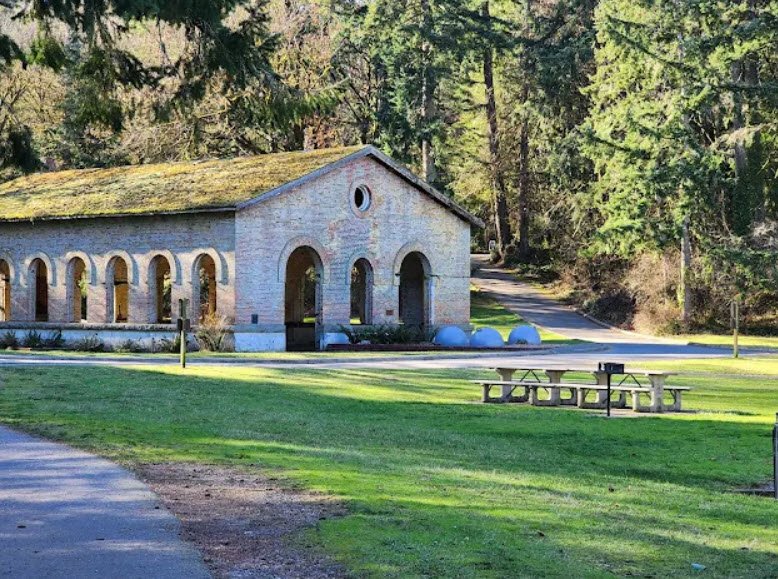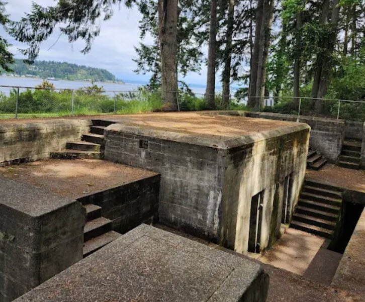 Once a harbor defense site protecting Bremerton shipyards, it features preserved military structures like a 1901 brick torpedo warehouse now serving as a reservable picnic shelter, Battery Mitchell gun casement, and interpretive exhibits amid Douglas fir and maple forests.