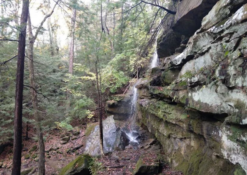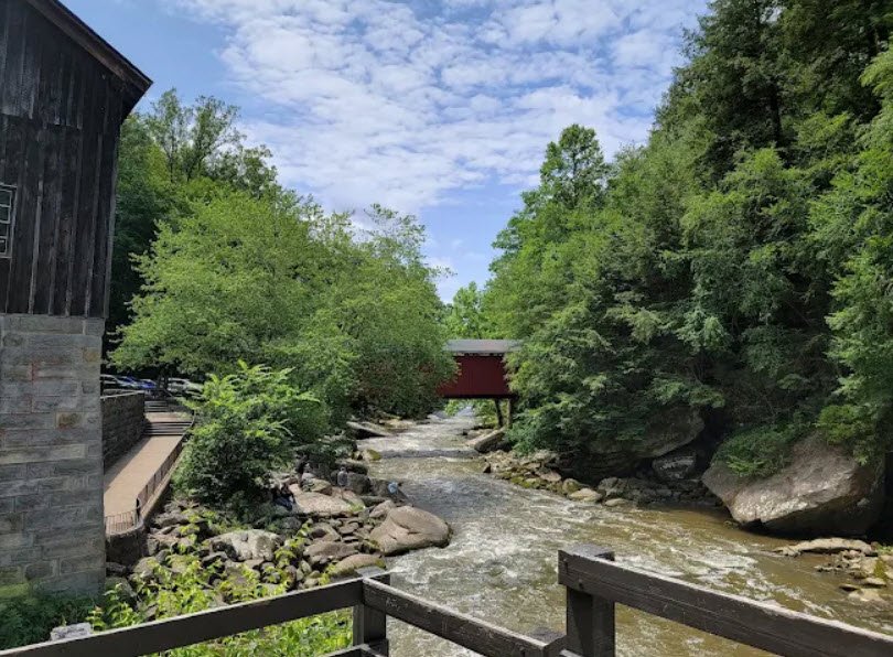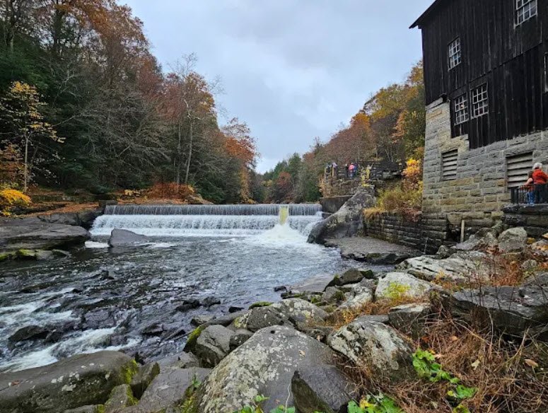 The park centers on a restored 19th-century gristmill and covered bridge accessible via a winding road through the rugged valley, offering hiking on 9 miles of trails like Hells Hollow and Slippery Rock Gorge, picnicking, fishing, rock climbing, and whitewater boating amid old-growth hemlock forests.
