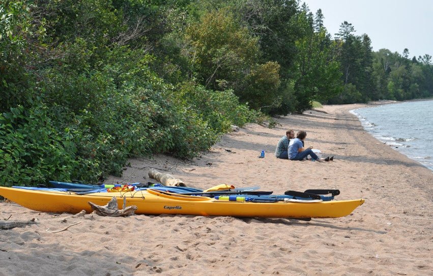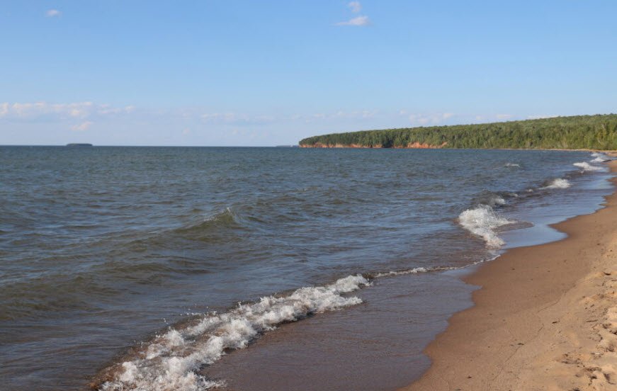 It is known for its scenic natural beauty, featuring a broad, clean shoreline with dramatic red and brown sandstone cliffs and sea caves nearby. The beach is popular for swimming, beachcombing, and picnics. It serves as a key access point for kayakers exploring the nearby Apostle Islands sea caves, with guided tours available for safety.