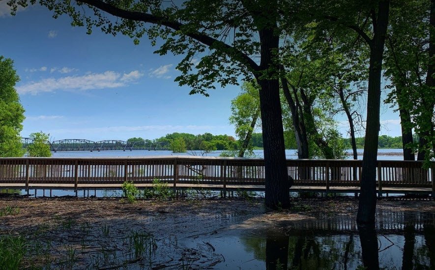 Minnesota Valley State Trail is a multi-use path in the Minneapolis-Saint Paul metro area, running about 34 miles parallel to the Minnesota River from Belle Plaine through Chaska and Shakopee to Bloomington, with a mix of unpaved natural surface for 19.5 miles and 9.8 miles of paved sections ideal for biking.