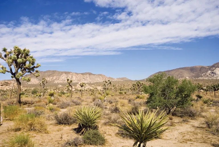 It lies between the cooler Great Basin Desert to the north and the hotter Sonoran Desert to the south, bordered by the Sierra Nevada to the west, with elevations typically from 2,000 to 5,000 feet but extremes like Death Valley's -282 feet below sea level nearby. The climate brings scorching summers, cold winters with occasional frost, and scant rainfall of 2-6 inches annually, mostly in winter, supporting unique plants like Joshua trees and wildlife such as desert tortoises adapted to the harsh conditions.