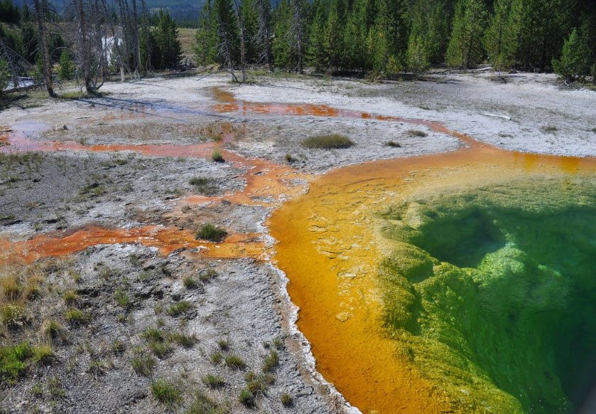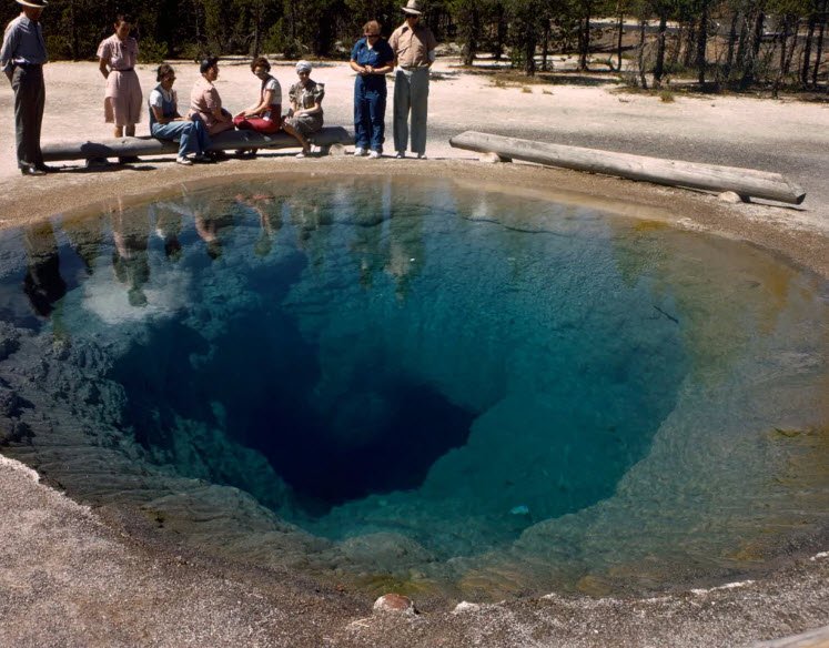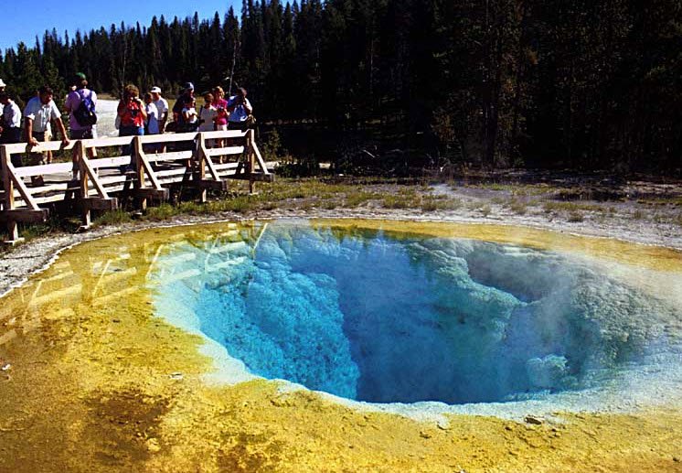 Named in the 1880s for its resemblance to the morning glory flower, the pool is renowned for its vibrant swirling colors of blues, greens, and yellows caused by heat-loving bacteria creating colorful mats. The pool’s water temperature averages around 159°F and is about 27.5 feet deep.